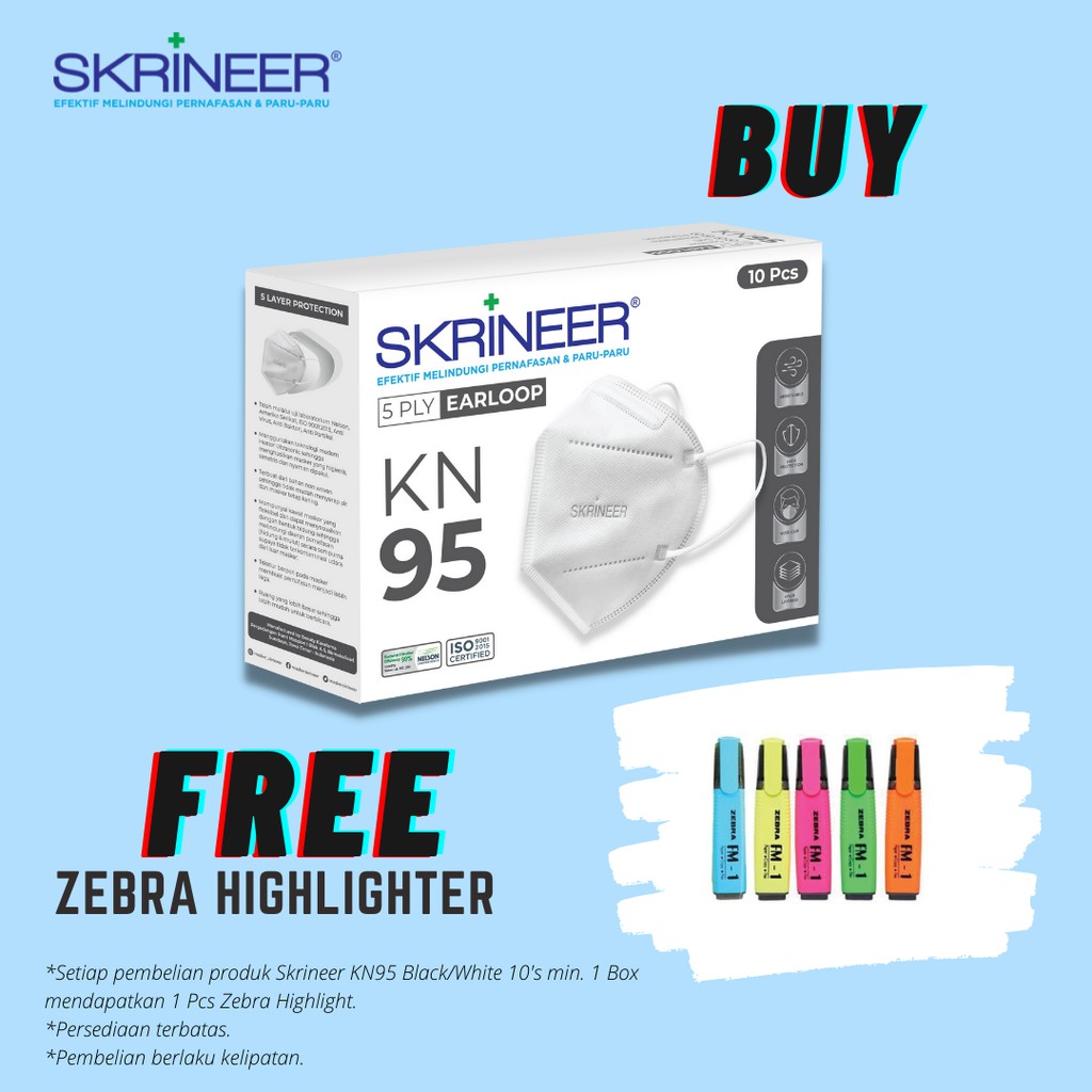 Skrineer Masker KN95 5ply White Earloop FREE Zebra Highlighter