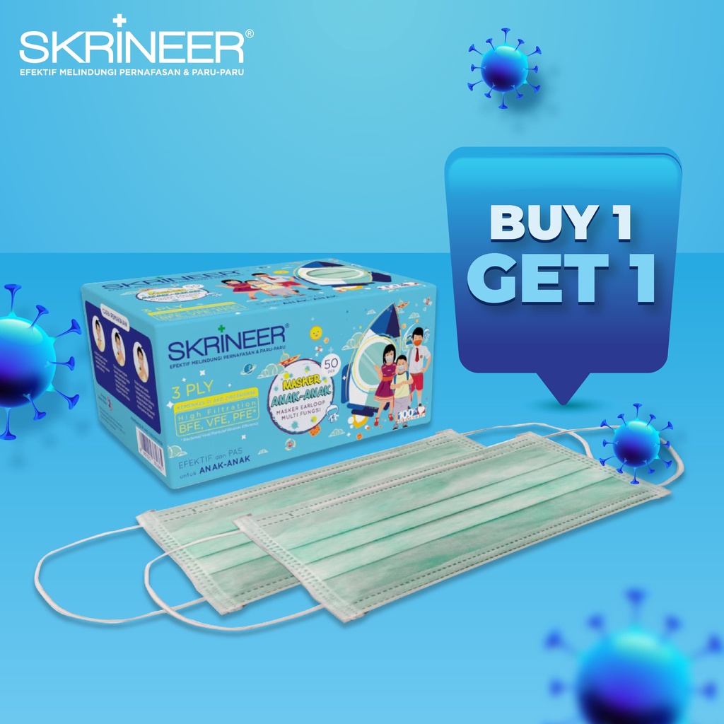Beli 1 gratis 1 - Skrineer Masker Anak 3ply Earloop Green Box isi 50 pcs